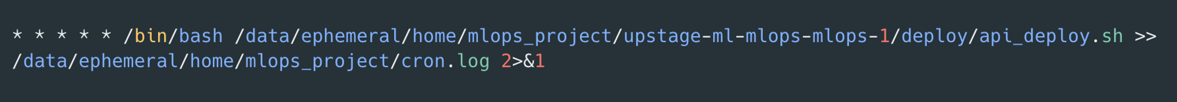 우선 업스테이지 서버의 배포는 배포 스크립트를 만들어서 추적하는 브랜치의 변경점이 있으면 FastAPI 서버를 재시작하도록 crontab 스케쥴러를 활용했습니다.