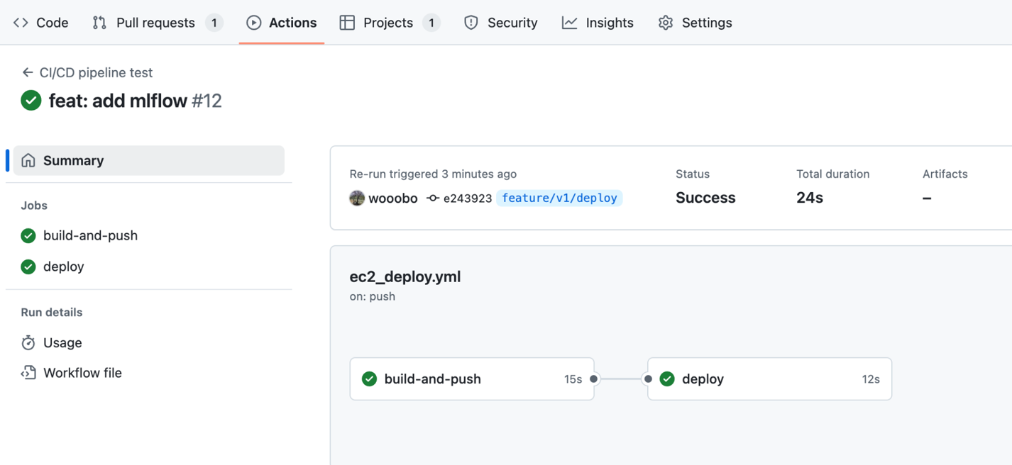우선 업스테이지 서버의 배포는 배포 스크립트를 만들어서 추적하는 브랜치의 변경점이 있으면 FastAPI 서버를 재시작하도록 crontab 스케쥴러를 활용했습니다. 이 단계에서는 MLFlow를 활용하여 프로세스를 진행하였습니다.