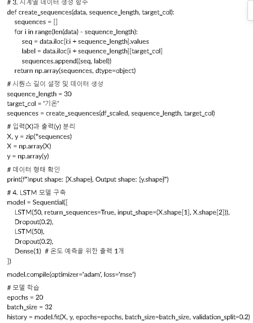 - 데이터 준비: 공공 API로 데이터 수집, 전처리, 정규화, 시계열 데이터 생성