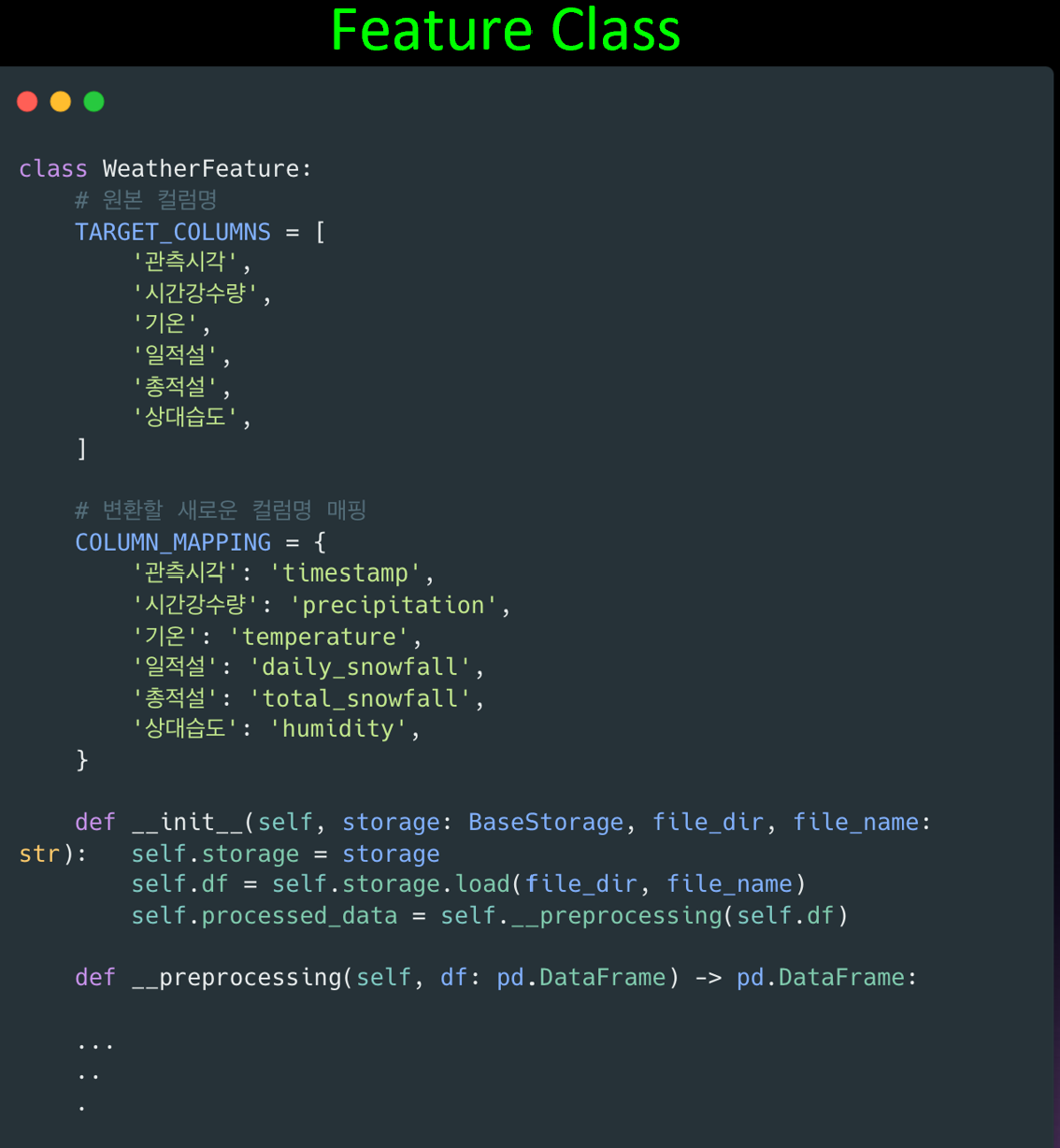 모델학습에 사용될 Feature Data는 일관된 스키마 구조를 유지하기 위헤 Feature Class를 만들었습니다.
